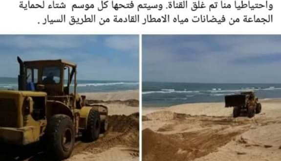 وفي الوقت الذي حملت فيه شركة لاساز المسؤولية في بلاغها الى شركات وجهات قد تكون استعملت في غفلة من الجماعة والسلطة قناة صرف الامطار لاغراضها الخاصة من خلال ربط قنوات الصرف الصحي  للمياه العادمة بالقناة المعنية فان رئيس الجماعة اكتفى في رد فعله اليتيم بنشر خبر الإغلاق من خلال نشر صور لجرافة الجماعة وهي تغلق منفذ القناة بالبحر دون الإشارة الى الإجراءات المزمع اتخاذها في حق الشركات المتورطة التي خرقت القانون  الجاري به العمل وميثاق البيئة وكأن الامر لا يستحق فتح تحقيق وتعيين لجن مختصة تنتهي بإصدار محضر رسمي يرفع الى الجهات المسؤولة كما هو متعارف عليه في مثل هذه الحالات.
