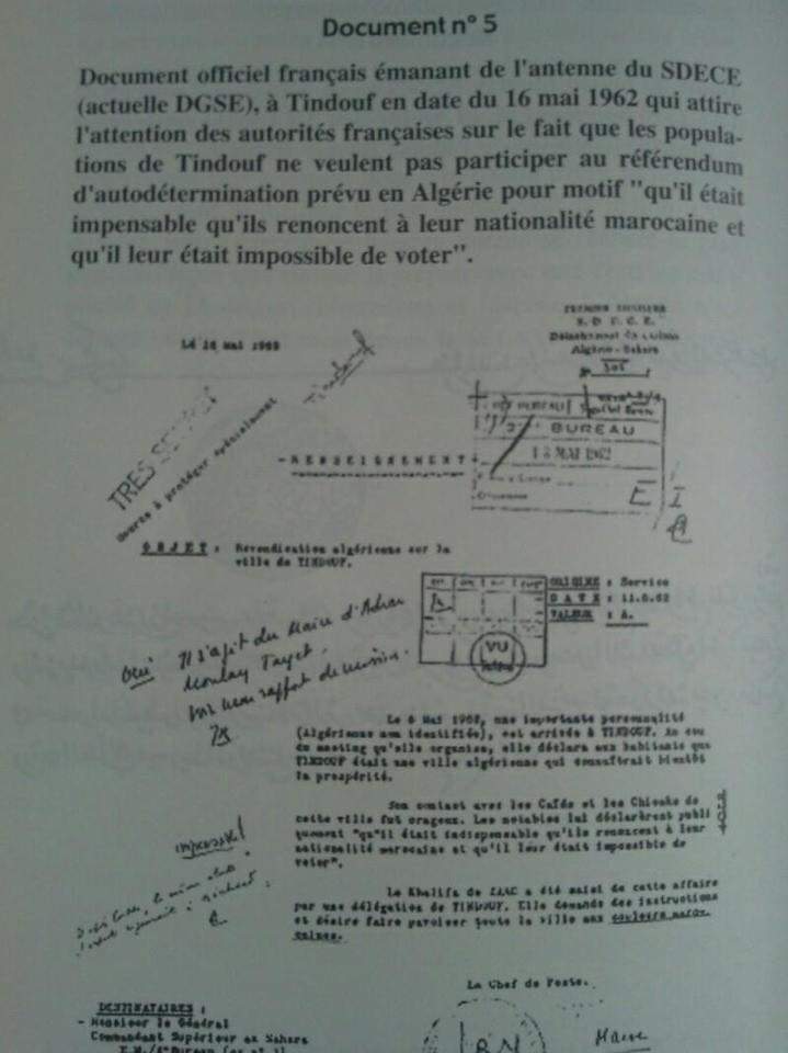 وحسب ما أكدته الوثيقة والتي هي عبارة عن مراسلة يرجع تاريخها إلى شهر ماي من سنة 1962 والتي كانت موجهة إلى السلطات الفرنسية بالعاصمة باريس ان سكان منطقة تندوف يعتبرون انفسهم مغاربة، ويرفضون مطلقا المشاركة في الإستفتاء الذي أدى إلى إستقلال الجزائر لاحقا.