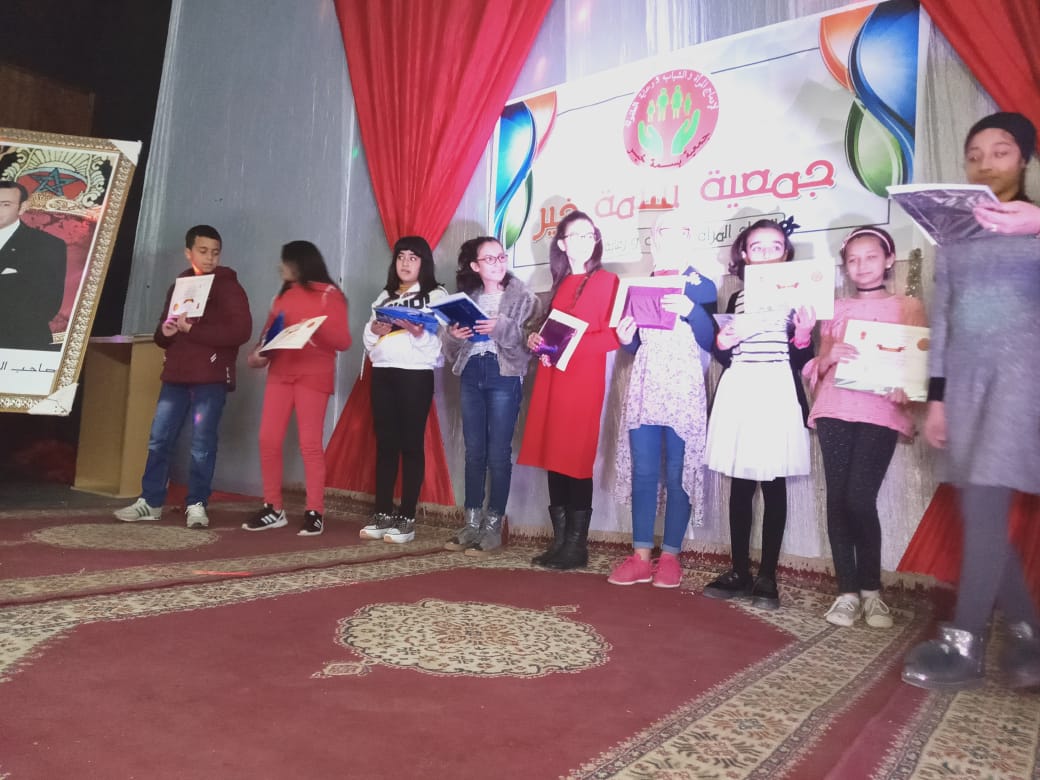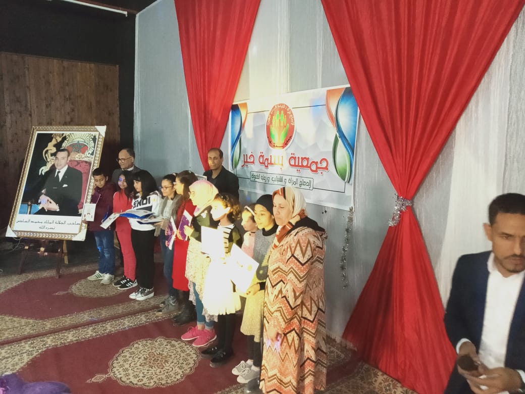 بتنسيق مع عدد من جمعيات امهات واباء واولياء المؤسسات العمومية نظمت جمعية بسمة خير لادماج المراة والشباب ورعاية الطفولة حفل تتويج التلاميذ المتفوقين خلال الاسدس الاول من السنة الدراسية 2019/2020 بدار الشباب ببني يخلف يوم السبت 15 فبراير من السنة الجارية افتتح الحفل بقراءة آيات بينات من الذكر الحكيم بصوت التلميذ ” ظريف ابراهيم ” تم كلمة رئيسة الجمعية السيدة ” لطيفة الحيطي ” التي رحبت بالمناسبة بالحاضرين من بينهم ممثلي قائد قيادة بني يخلف وبعض من اعضاء المجلس الجماعي لبني يخلف و الدرك الملكي و الأطر التربوية والإدارية للمؤسسات المشاركة الذين يبذلون كل الجهد من اجل تاهيل نخبة متميزة و متفوقة من التلاميذ